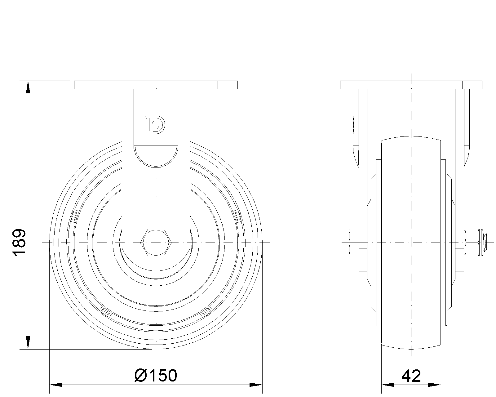 固定的腳輪,焊接鋼板架,表面黑漆 底板式安裝裝置,孔距85x70 鑄鐵製輪芯,高品質聚氨酯輪面,銑褐色 輪子軸承—精密滾珠,附鐵蓋 |