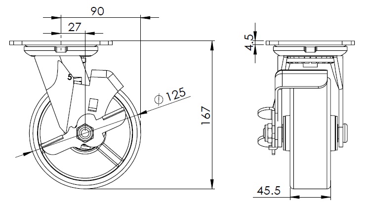 | Đường kính bánh xe PU (màu đen) × chiều rộng bánh xe 125 x 45.5mm |