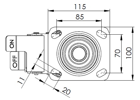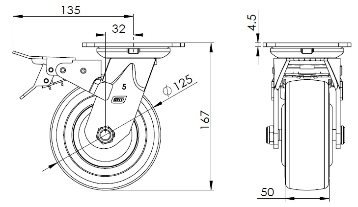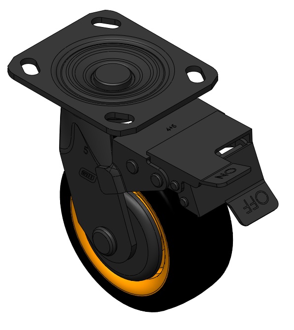 | Bánh xe có phanh trước và hệ thống khóa. Khung thép hàn. Bề mặt mạ điện. Đế lắp đặt. Lõi bánh xe bằng polypropylen chống va đập với gai lốp bằng nhựa nhiệt dẻo đàn hồi (TPR). Màu cam và đen. Vòng bi bánh xe: vòng bi bi chính xác. |