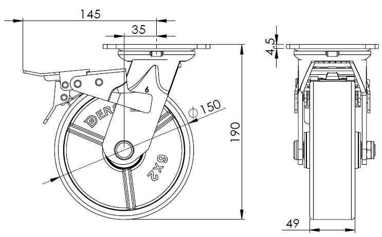 | Bánh xe PU (màu đỏ) đường kính bánh xe × chiều rộng bánh xe 150 x 49mm |