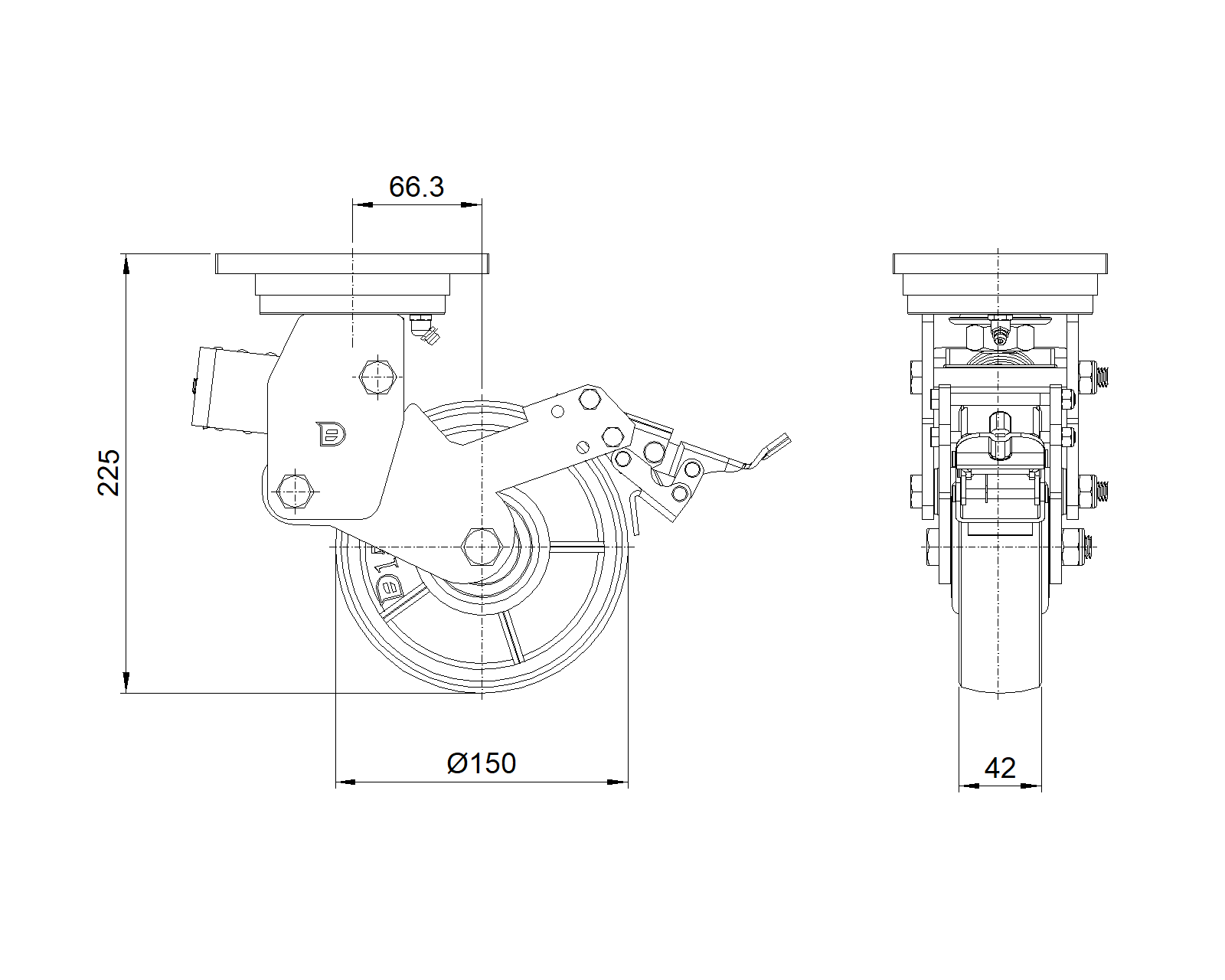 Casters with rear brake, Spring-loaded With locking system, Welded Caster Fork