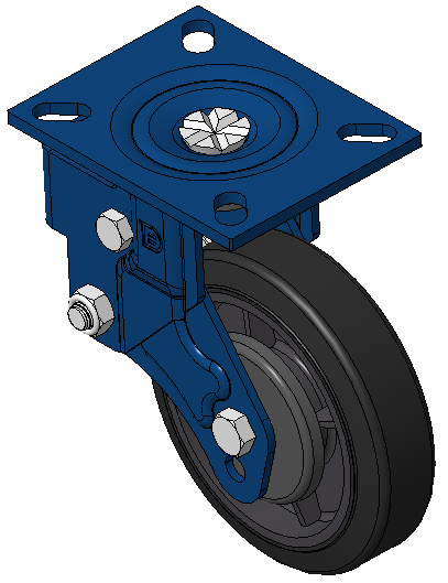 Swivel Spring-loaded Caster with Welded Caster Fork Blue painted finish, Mounting Type - Top Plate, 105 x 78.5 Bolt Hole Spacing Cast Iron core with High-Quality, highly Resilient Rubber Wheel Tread Cast Iron black, Bearing—Ball Bearings |