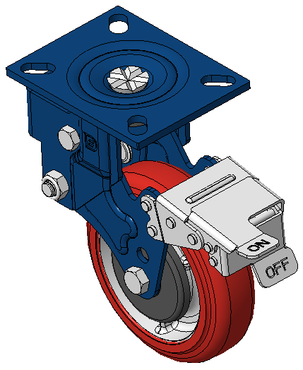 Spring-loaded Caster with front brake, Welded Caster Fork Blue-painted finish, Mounting Type - Top Plate, 105 x 78.5 Bolt Hole Spacing Cast Iron core, High Quality Polyurethane Wheel Tread Red Cast Iron finish, Ball Bearings |