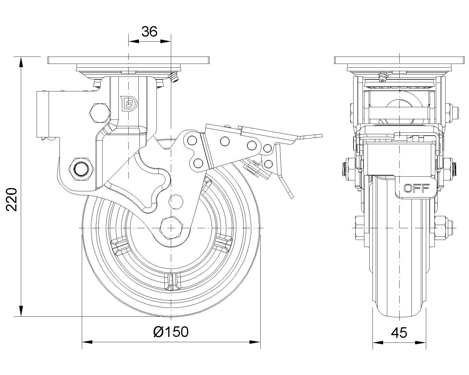 | PU Bánh xe (vòng cung đỏ) Đường kính bánh xe × Chiều rộng bánh xe 150 x 45mm |
