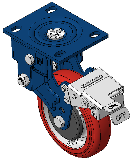 | Bánh xe lò xo có phanh trước, khung thép hàn Hoàn thiện sơn xanh, lắp đế, khoảng cách lỗ 105 x 77,5 Lõi gang, mặt lốp polyurethane chất lượng cao Hoàn thiện phay đỏ, vòng bi chính xác |