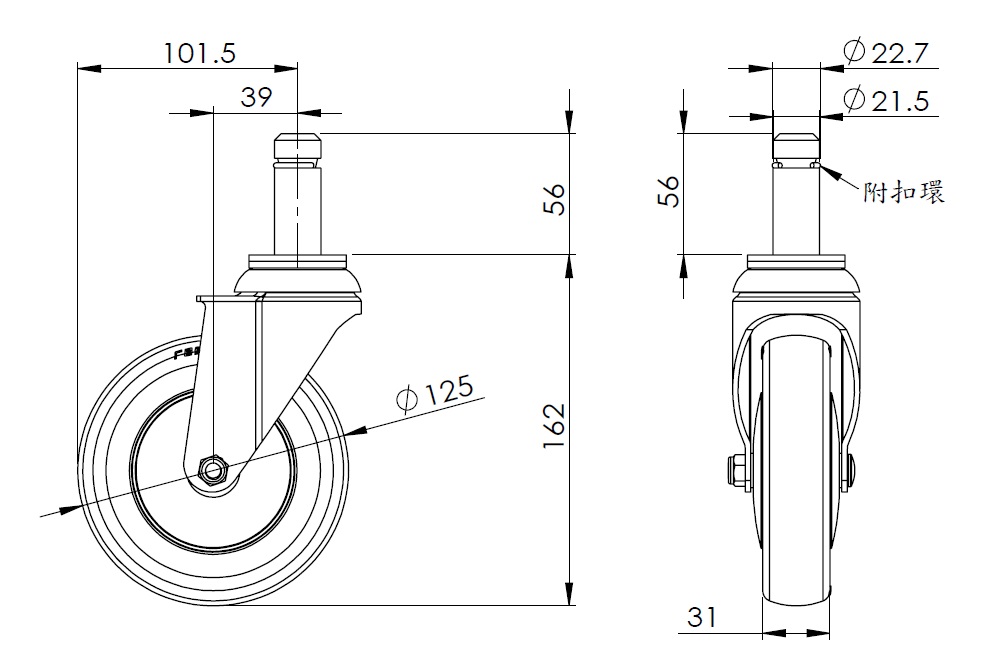 | 活動式腳輪,插心鉚合沖壓腳架—Ø21.5x56L 表面振動,插心式安裝裝置,附扣環 耐衝擊聚丙烯輪芯,熱塑性彈性体(TPR)輪面 灰色,輪子軸承—精密滾珠。 |