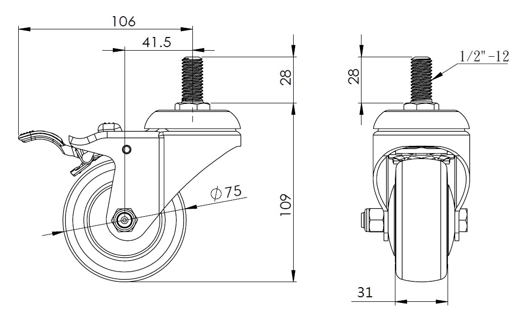 | 配有雙煞式,鎖定系統的腳輪。牙心鉚合沖壓腳架—1/2"-12牙 表面振動,絲扣式安裝裝置(鋅鋁合金踏板) 耐衝擊聚丙烯輪芯,熱塑性彈性体(TPR)輪面 灰色,輪子軸承—精密滾珠。 |