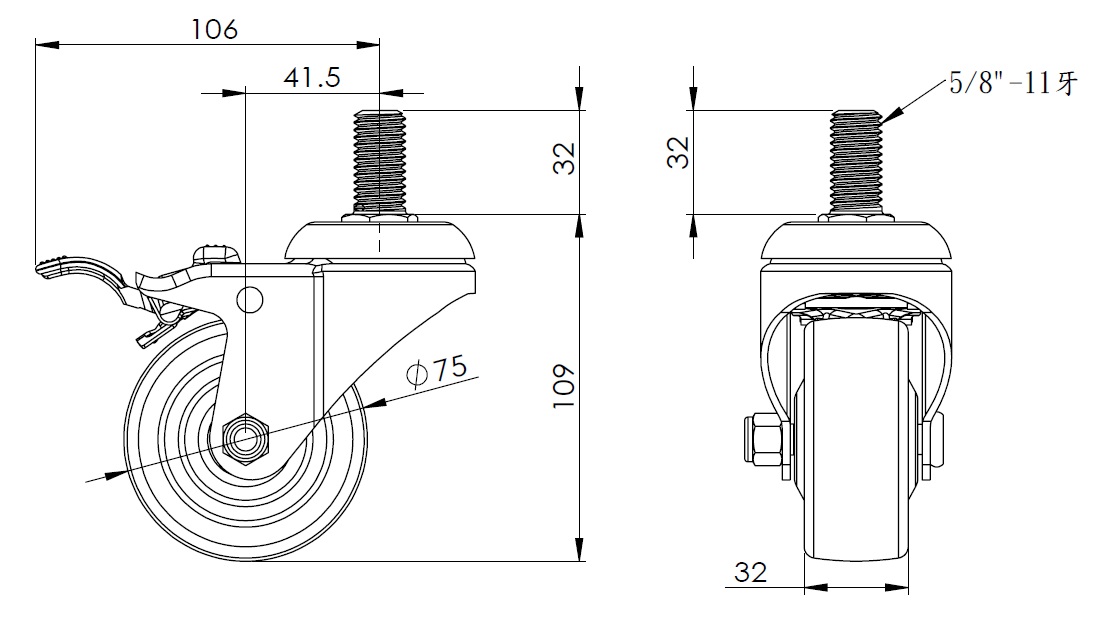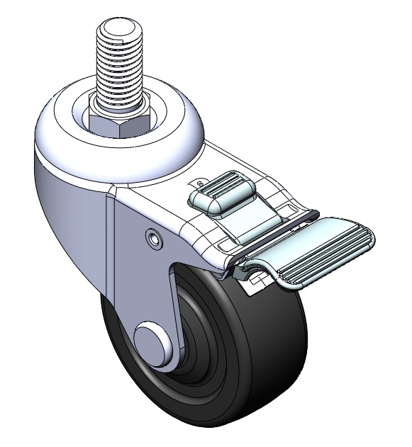 | Equipped with double-brake With locking system Casters. Stamping feet with Riveted cores—5/8"-11 teeth. Surface vibration resistant, Mounting Type - Threaded Stem. High-Quality Resilient Rubber Wheel Center and rim. Black, Plain Bearings. |