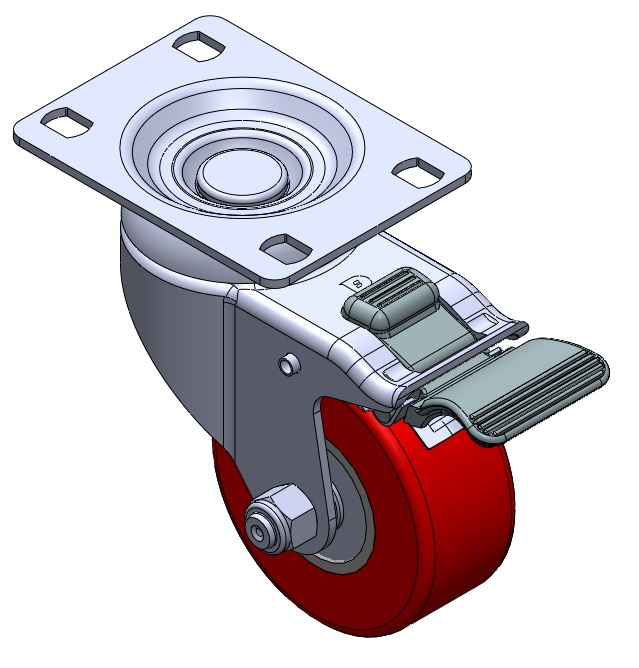 | 固定式腳輪,一體成型沖壓腳架 —高級孔 表面振動,底板式安裝裝置 鑄鐵製輪芯,高品質聚氨酯輪面 銑紅色,輪子軸承—精密滾珠。 |