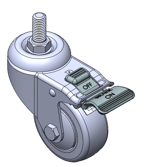 | 活動式腳輪,牙心鉚合沖壓腳架—1/2"-12牙 表面振動,絲扣式安裝裝置 耐衝擊聚丙烯輪芯,熱塑性彈性體(TPR)輪面 灰色,輪子軸承—精密滾珠。 |