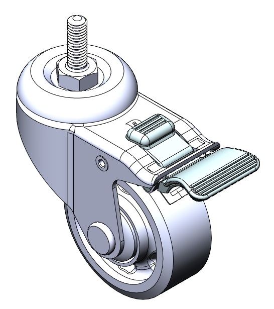 | 配有雙煞式,鎖定系統的腳輪。牙心鉚合沖壓腳架—3/8"-16牙 表面振動,底板式安裝裝置 加強式耐衝擊聚丙烯輪芯,熱塑性彈性體(TPR)輪面 灰色,輪子軸承—精密滾珠。 |