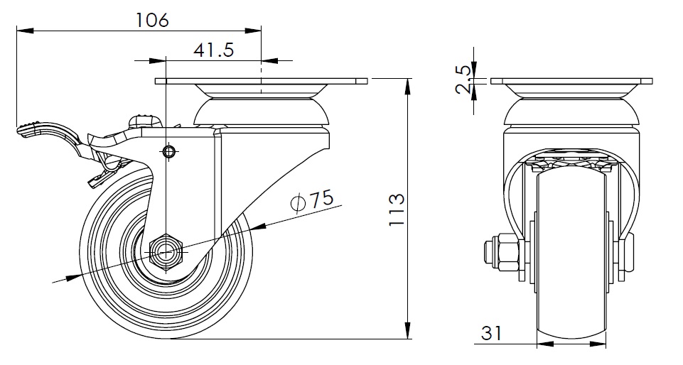 | 配有雙煞式,鎖定系統的腳輪。底板鉚合沖壓腳架—高級孔 表面振動,底板式安裝裝置 鋁製輪芯,高品質聚氨酯輪面 灰色,輪子軸承—精密滾珠。 |