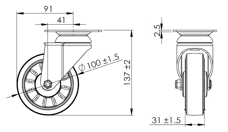 | 活動式腳輪,底板鉚合沖壓腳架—高級孔 表面振動,底板式安裝裝置 加強型熱可塑性塑料輪芯、輪面 白色,輪子軸承—精密滾珠。 |