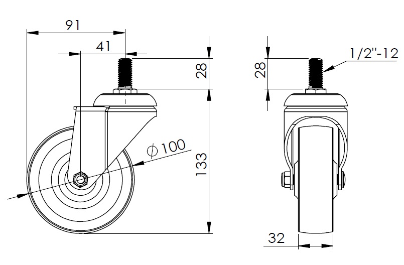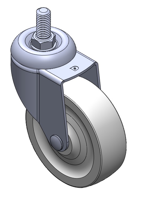| 活動式腳輪,牙心鉚合沖壓腳架—1/2"-12牙 表面振動,絲扣式安裝裝置 熱可塑性塑料輪芯、輪面 白色,輪子—中管式。 |