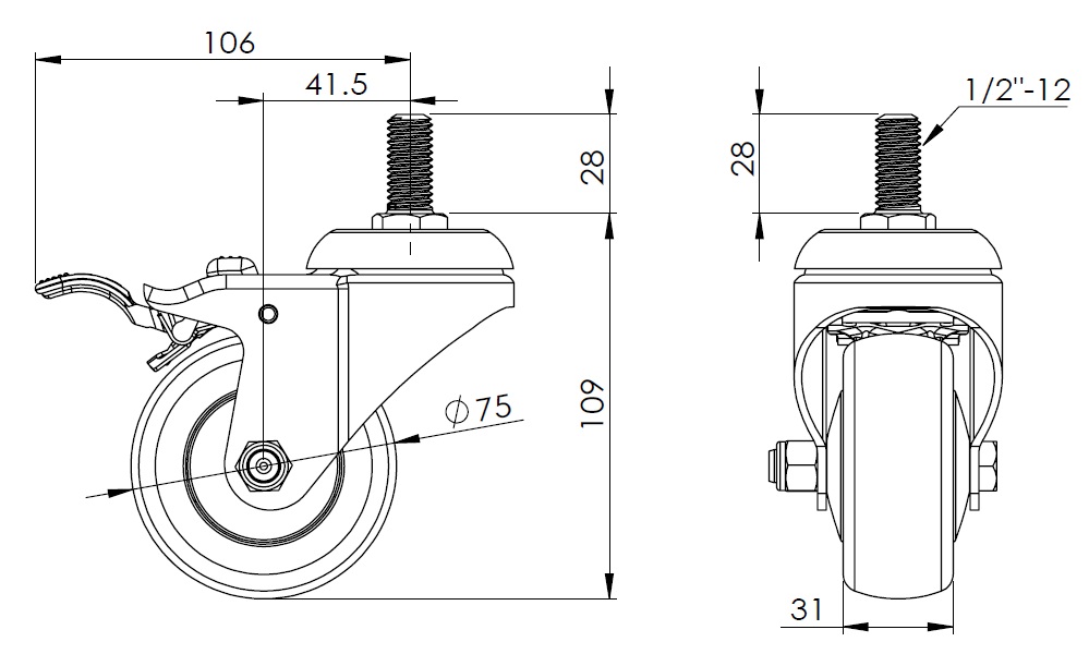 | 配有雙煞式,鎖定系統的腳輪。牙心鉚合沖壓腳架—1/2"-12牙 表面振動,絲扣式安裝裝置(鋅鋁合金踏板) 耐衝擊聚丙烯輪芯,熱塑性彈性體(TPR)輪面 灰色,輪子軸承—精密滾珠。 |
