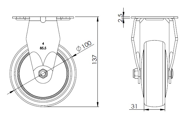 | Bánh xe cố định, khung dập liền khối — lỗ thông hơi dụng cụ Bề mặt rung, thiết bị lắp đặt tấm đế Lõi bánh xe bằng polypropylene chống va đập, bề mặt bánh xe bằng nhựa nhiệt dẻo đàn hồi (TPR) Màu xám, ổ bi — ổ bi chính xác. |