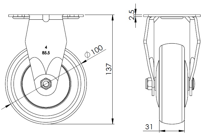 | Bánh xe PPR (S) đường kính bánh xe × chiều rộng bánh xe 100 x 31mm |