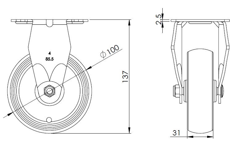 | Bánh xe nylon Đường kính bánh xe × chiều rộng bánh xe 100 x 31mm |