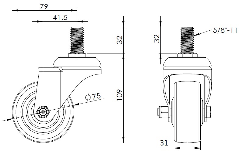 | Bánh xe di động, chân đế ren dập khuôn – 5/8"-11 răng; bề mặt chống rung, lắp đặt bằng ren; lõi và bề mặt bánh xe bằng cao su đàn hồi chất lượng cao; bánh xe màu đen, có ống trung tâm. |