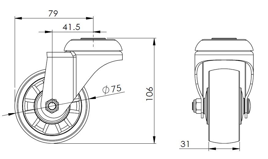 | Bánh xe di động, chân đế dập rỗng tán đinh – lỗ rỗng Ø10.2 Rung bề mặt, thiết bị lắp đặt khóa liên động Lõi bánh xe và bề mặt bánh xe bằng nhựa nhiệt dẻo gia cường Màu trắng, ổ bi bánh xe – ổ bi cầu chính xác. |