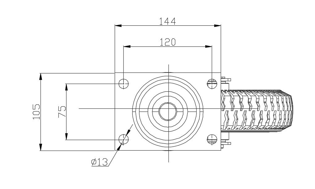 Swivel Caster with Riveted Fork and Stamping Fork. Blue-painted finish, Top Plate (5T) Mounting Type system. Cast Iron Wheel Center, High-Quality Resilient Rubber tread; Wheel Tread provides Compression Resistance and Abrasion Resistance. Black, Bearing—Ball Bearing. |