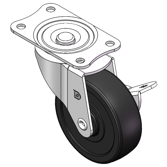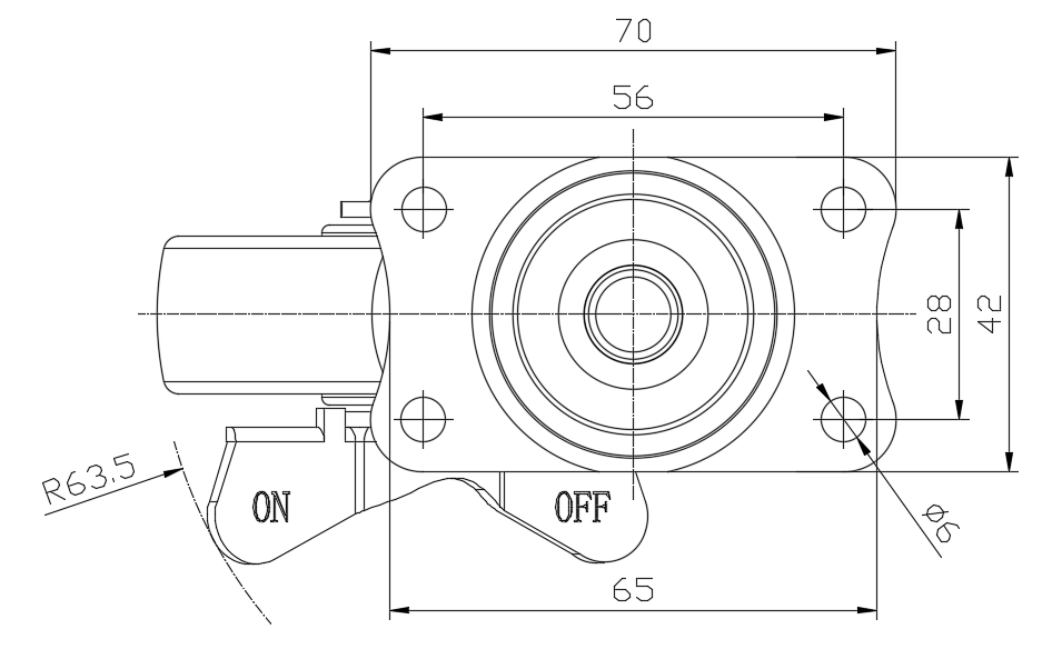 | 配有侧(轮)煞式,锁定系统的脚轮。底板铆合冲压脚架—孔距56x28