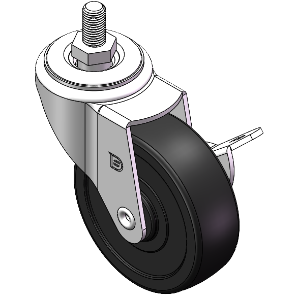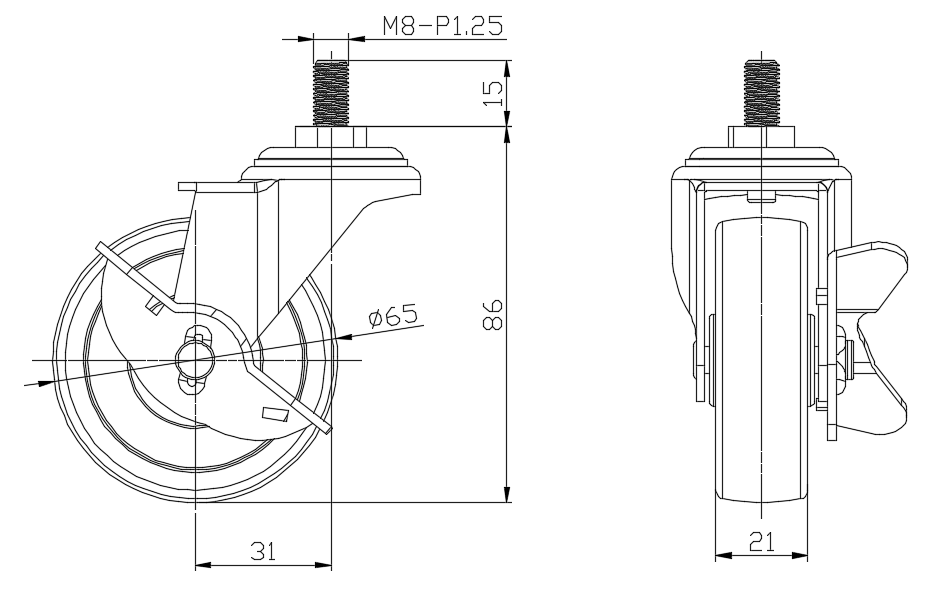 | 配有侧(轮)煞式,锁定系统的脚轮。牙心铆合沖压脚架—M8-P1.25