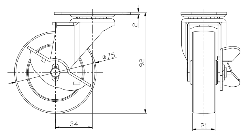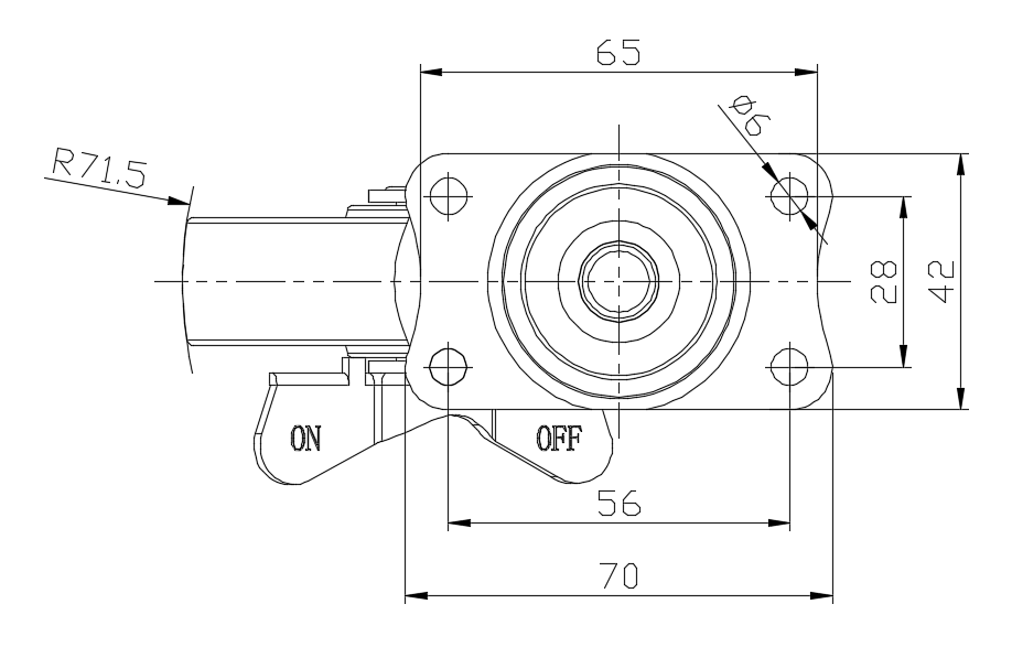 | 配有侧(轮)煞式,锁定系统的脚轮。底板铆合冲压脚架—孔距56x28
