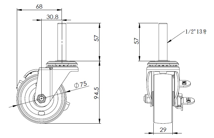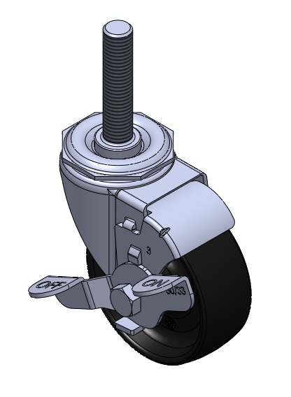 Casters with Side Brakes and With locking system. Riveted Stamping Fork with 1/2"-13 UNC.