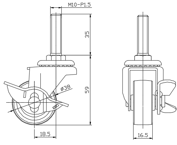 Equipped with side (wheel) brakes and a With locking system for the Casters. Stamping, Riveted feet—M10-P1.5