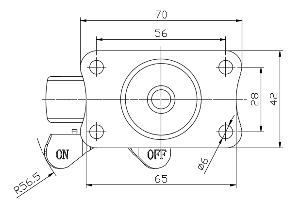 | 配有側(輪)煞式,鎖定係統的腳輪。底板鉚合沖壓腳架—孔距56x28