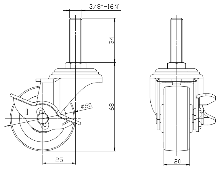 | 配有側(輪)煞式,鎖定係統的腳輪。牙心鉚合沖壓腳架—3/8"-16牙
