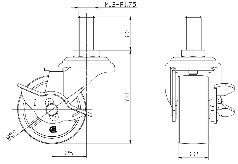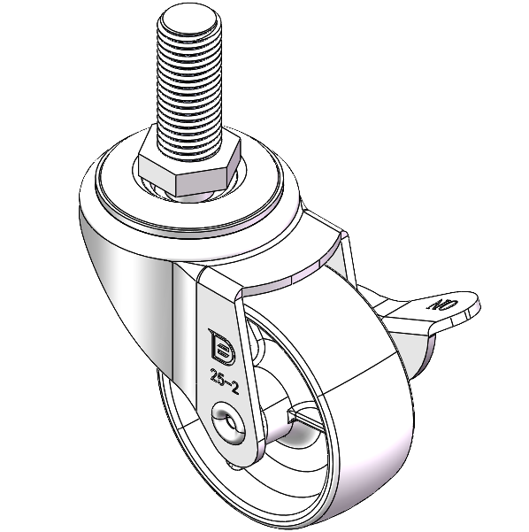 | 配有側(輪)煞式,鎖定係統的腳輪。牙心鉚合沖壓腳架—M12-P1.75