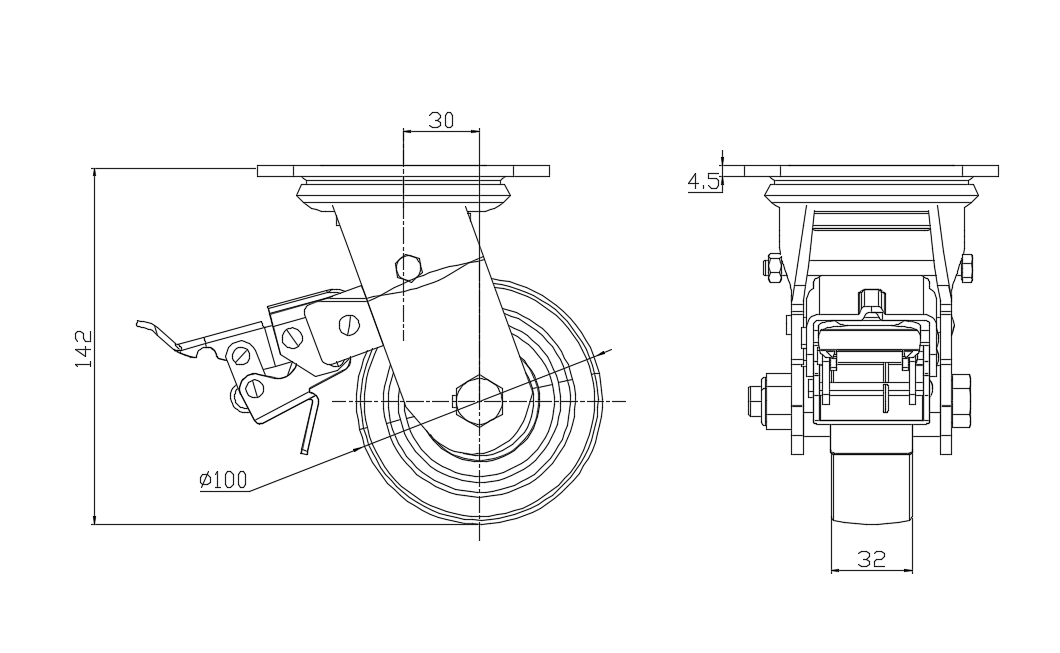 Casters with center brake and Locking system. Top Plate Riveted Stamping Fork - D-type hole Surface Zine-Plated, Top Plate (4.5T) Mounting Type device Reinforced Polypropylene and Wheel Tread Transparent, Bearing - Ball Bearing. |