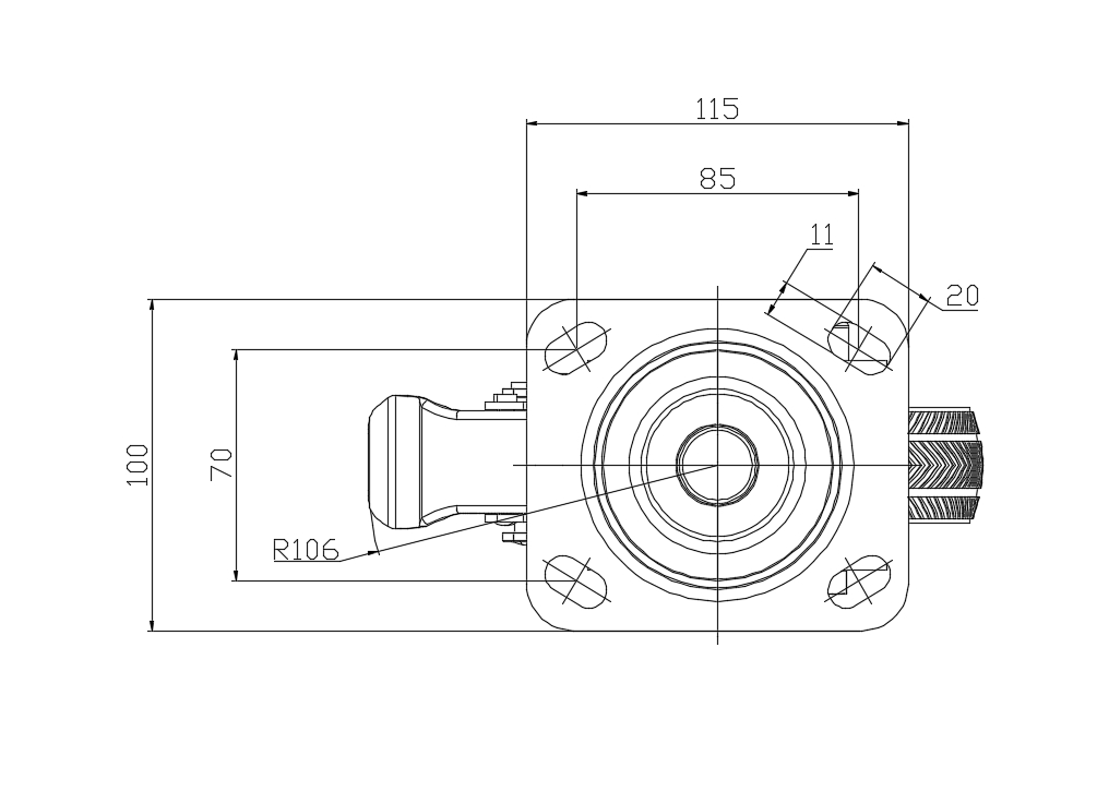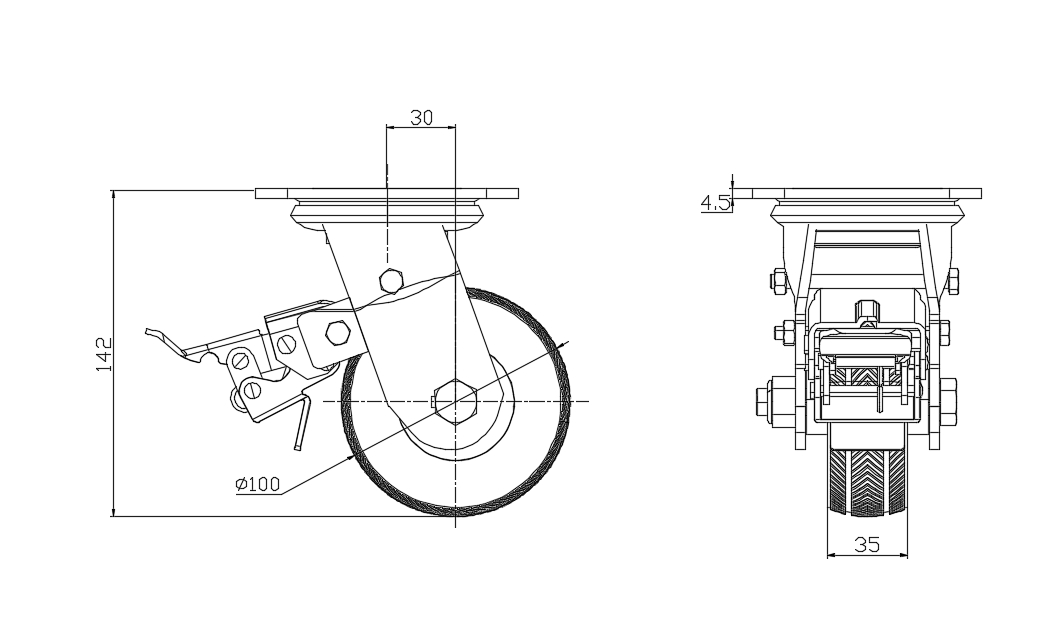 Center Brake Locking system. Top Plate with Riveted, Stamping Fork and 85 x 70mm (3-3/8" x 2-3/4") Bolt Hole Spacing. Zine-Plated, Top Plate (4.5T) Mounting Type system. Cast Iron Wheel Center with High-Quality Resilient Rubber tread. Iron black, Bearing with Ball Bearing. |