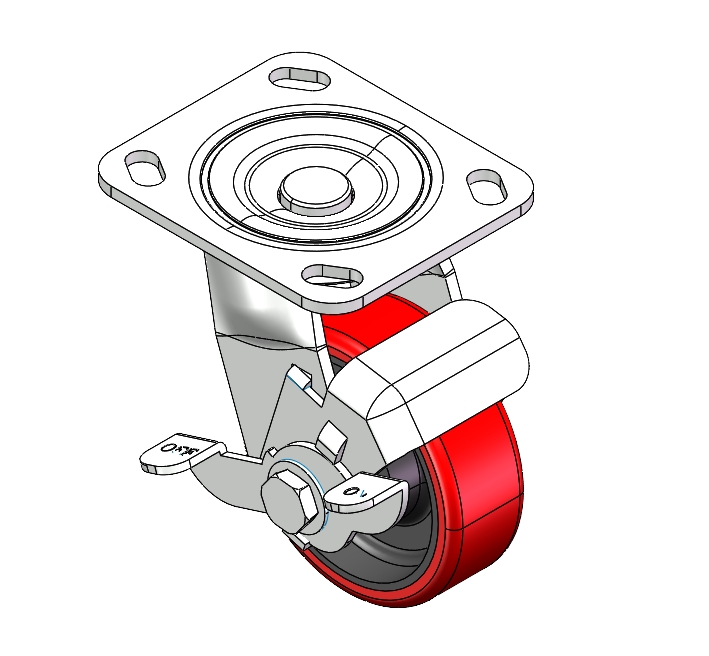 Side brake Caster with Locking system. Top Plate Riveted and Stamping - D-shaped. Hole Zine-Plated, Top Plate (4.5T) Mounting Type system Cast Iron Wheel Center with High Quality Polyurethane tread Red Cast Iron finish, Bearing - Ball Bearing. |