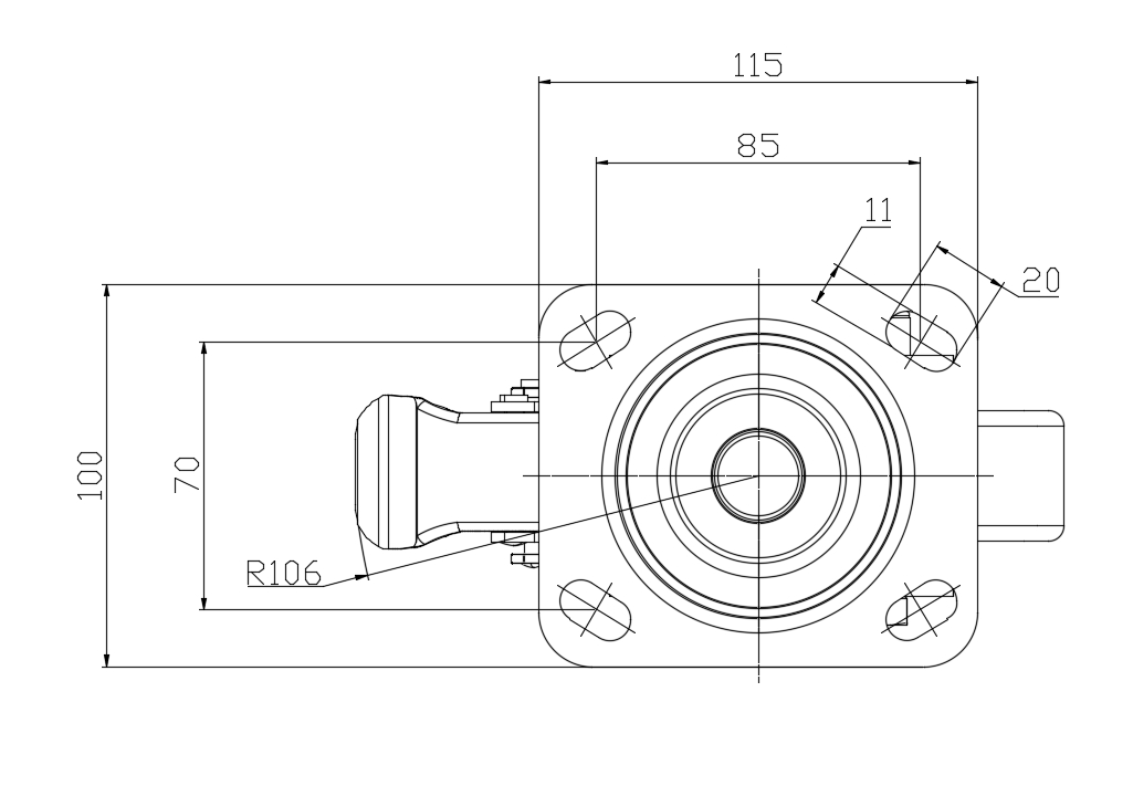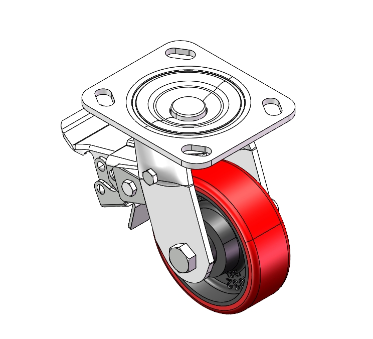 Center Brake Locking system. Top Plate Riveted and Stamping 85 x 70mm (3-3/8" x 2-3/4") Bolt Hole Spacing. Zine-Plated, Top Plate (4.5T) Mounting Type system. Cast Iron Wheel Center with High Quality Polyurethane tread. Red Cast Iron finish, Bearing—Ball Bearing. |