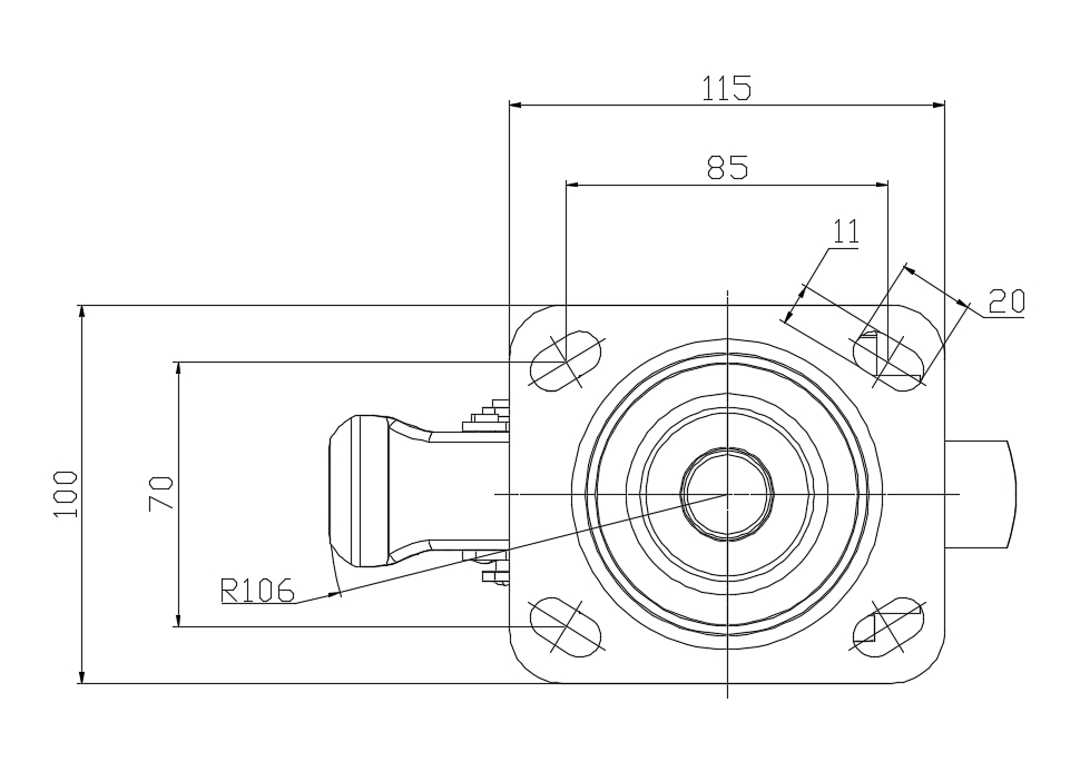 Plate Size 115 x 100mm Bolt Hole Spacing 85 x 70mm Plate Hole 20 x 11mm Offset 30mm Swivel Interference 212mm Overall Height 138.5mm Swivel Radius 106mm Hardness Of Tread ° Shore A Load Capacity (Dynamic) 175kgs |