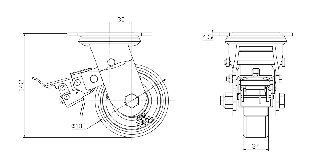 Center Brake Locking system. Top Plate with Riveted, Stamping Fork and 85 x 70mm (3-3/8" x 2-3/4") Bolt Hole Spacing. Zine-Plated, Top Plate (4.5T) Mounting Type system. Cast Iron Wheel Center with High Quality Polyurethane tread. Iron brown, Bearing with Ball Bearing. |
