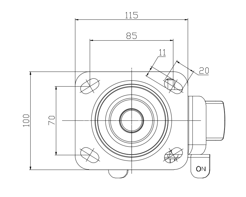 Casters with Side Brakes and With locking system. Top Plate with Riveted Stamping Fork and 85 x 70mm (3-3/8" x 2-3/4") Bolt Hole Spacings.
