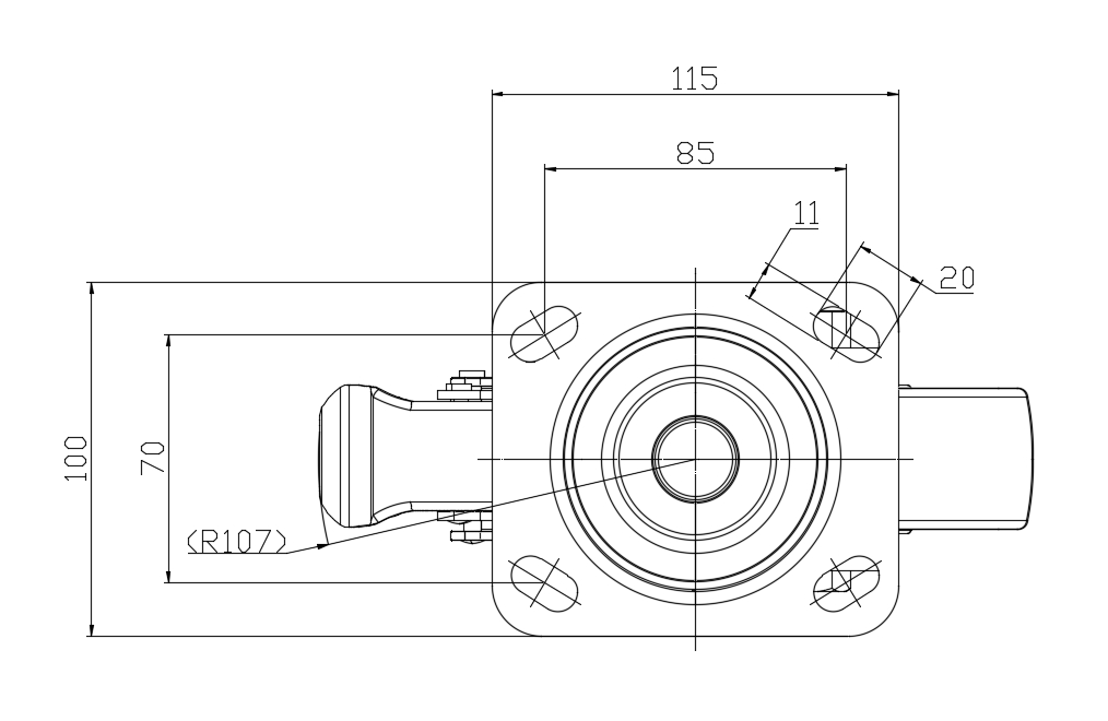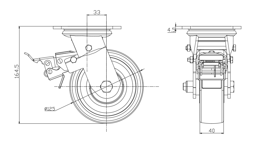 Casters with a center brake and With locking system. Top Plate Riveted and Stamping 85 x 70mm (3-3/8" x 2-3/4") Bolt Hole Spacing.