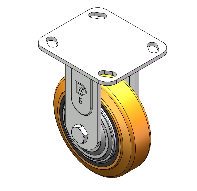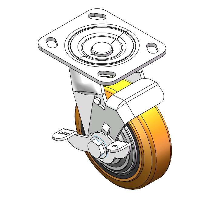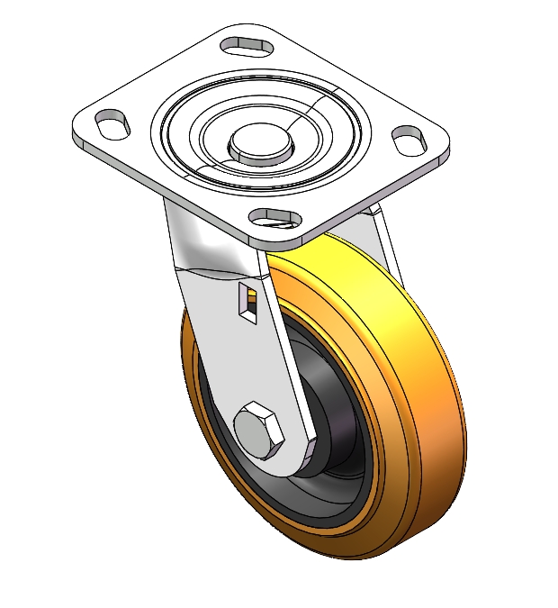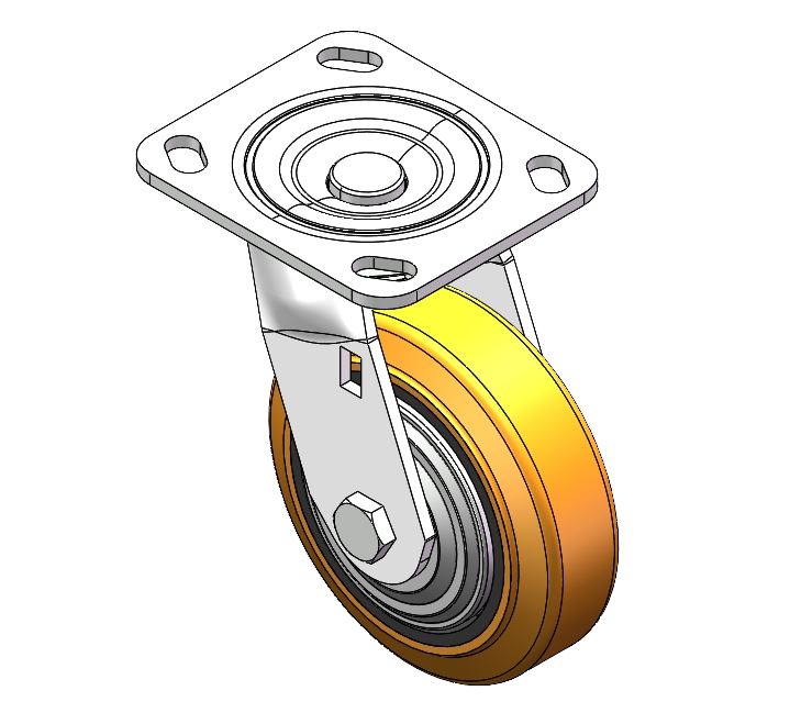 Zine-Plated, Top Plate (4.5T) Mounting Type mechanism. Cast Iron core with High-Quality Resilient Rubber Wheel Tread. Orange color, Bearing with Ball Bearings. |