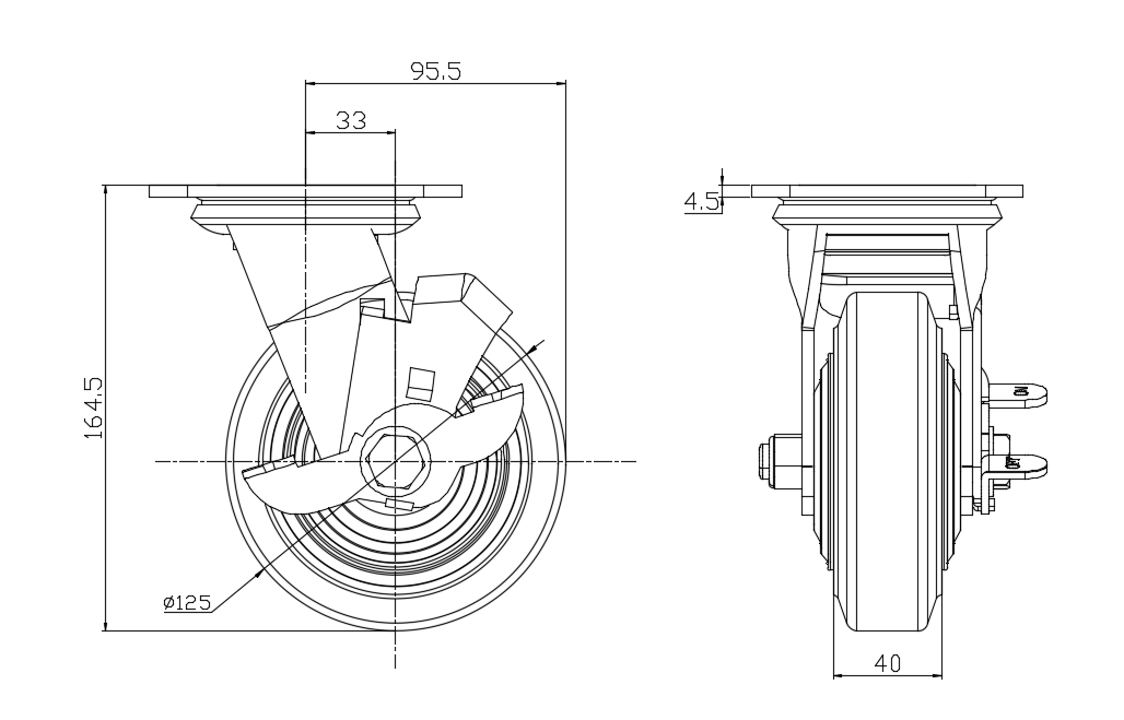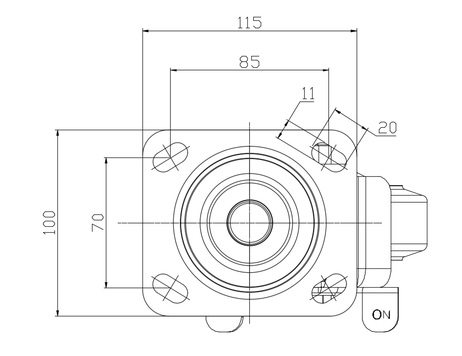 Side Brake Caster with With locking system. Top Plate with Riveted Stamping Fork and 85 x 70mm (3-3/8" x 2-3/4") Bolt Hole Spacings.