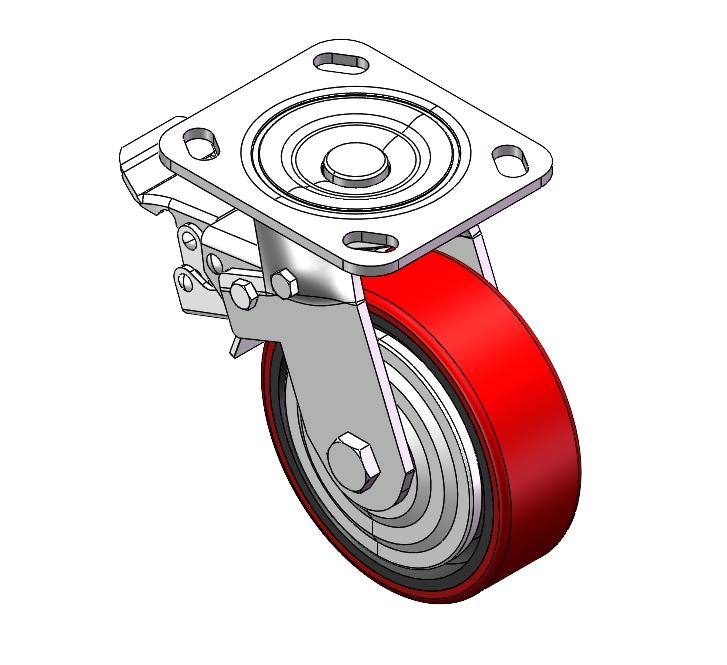 Center Brake Locking system. Top Plate Riveted and Stamping 85 x 70mm (3-3/8" x 2-3/4") Bolt Hole Spacing. Zine-Plated, Top Plate (4.5T) Mounting Type system. Cast Iron Wheel Center with High Quality Polyurethane tread. Red Cast Iron finish, Bearing—Ball Bearing. |