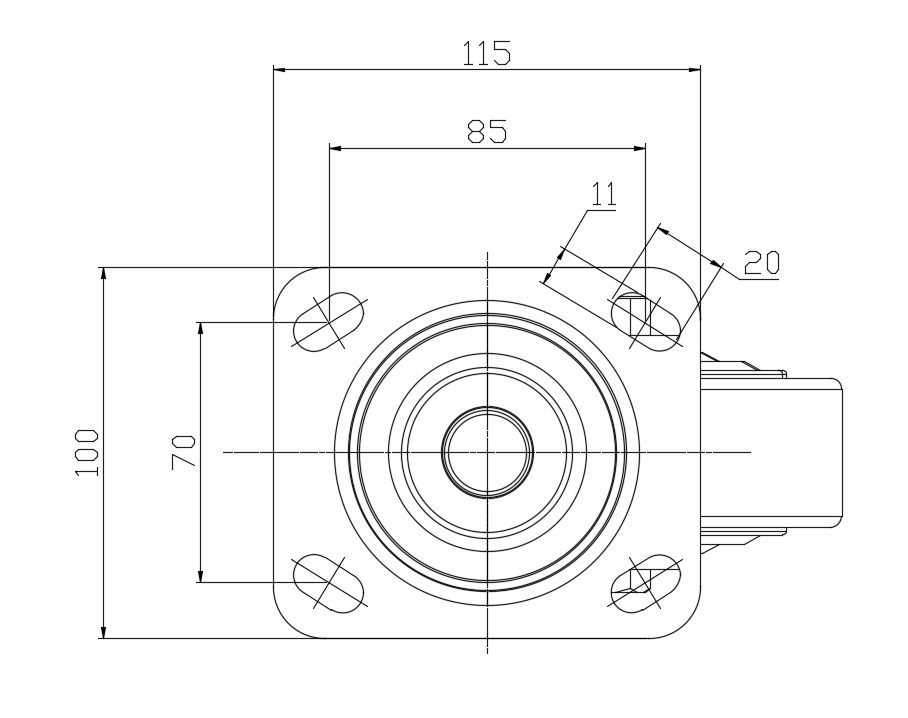 Plate Size 115 x 100mm Bolt Hole Spacing 85 x 70mm Plate Hole 20 x 11mm Offset 33mm Swivel Interference 191mm Overall Height 164.5mm Swivel Radius 95.5mm Hardness Of Tread 93±5° Shore A Load Capacity (Dynamic) 250kgs |