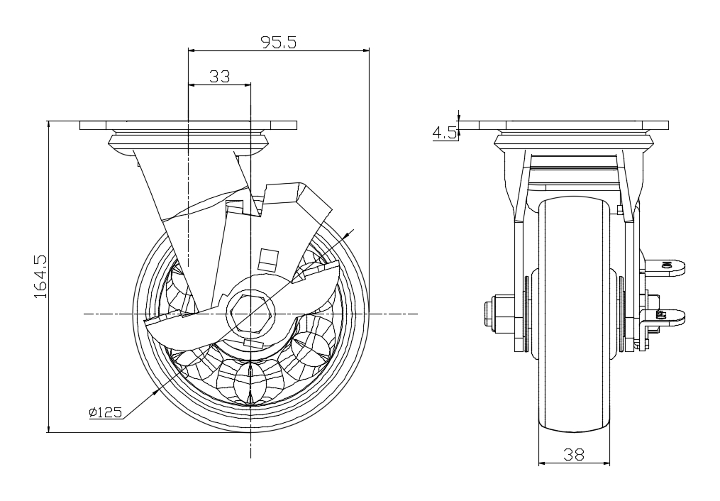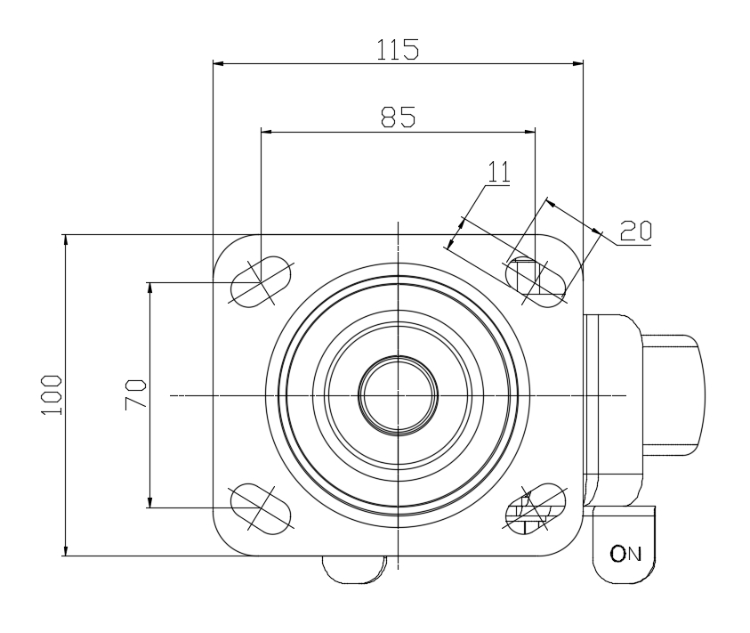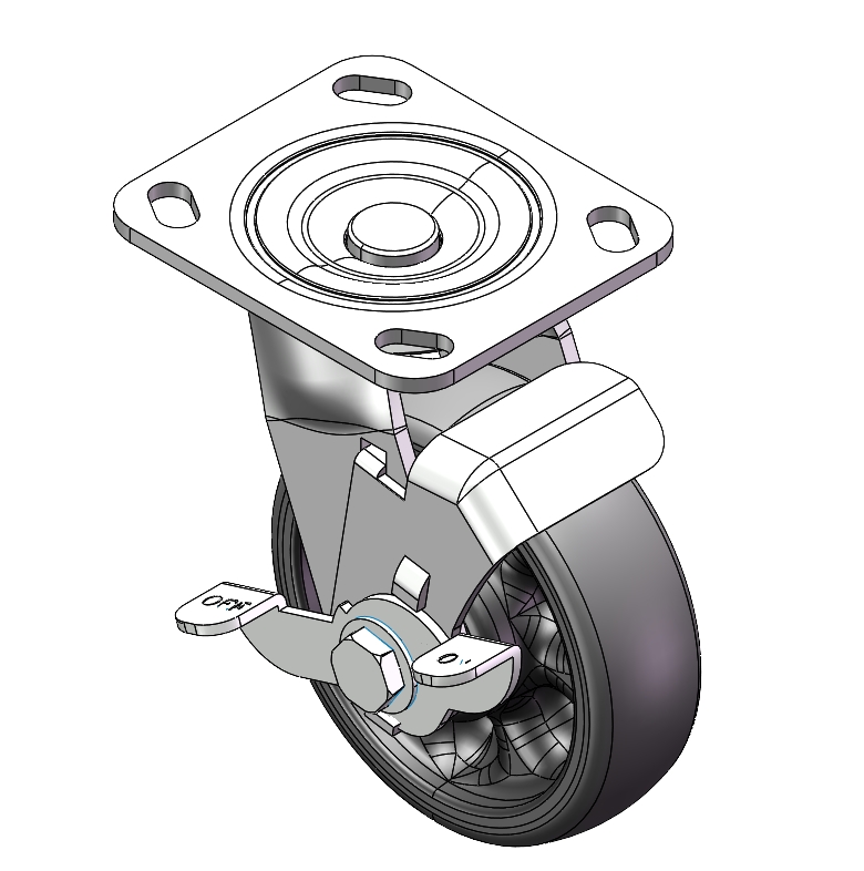 Side Brake Caster with With locking system. Base plate with Riveted Fork (85 x 70mm (3-3/8" x 2-3/4") Bolt Hole Spacing).