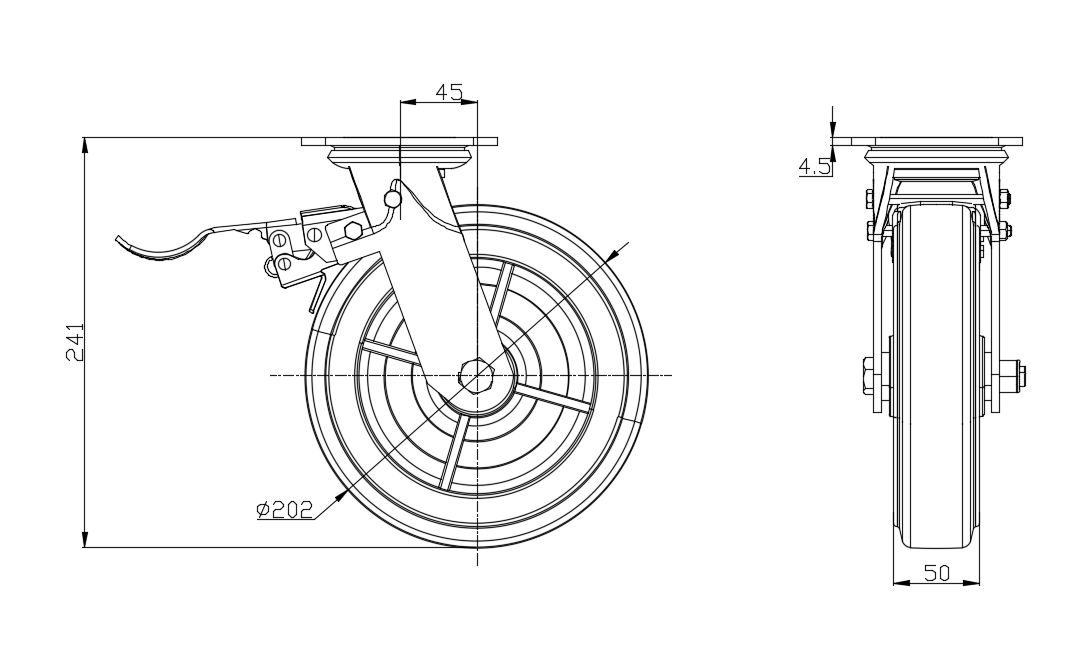 | Center Brake Locking system. Top Plate Riveted and Stamping 85 x 70mm (3-3/8" x 2-3/4") Bolt Hole Spacing. Zine-Plated, Top Plate (4.5T) Mounting Type. Reinforced, impact-resistant High-quality Impact Resistance Polypropylene Wheel Center with High-Quality Thermoplastic Rubber (TPR) tread. Light gray, Bearing with Ball Bearing. |