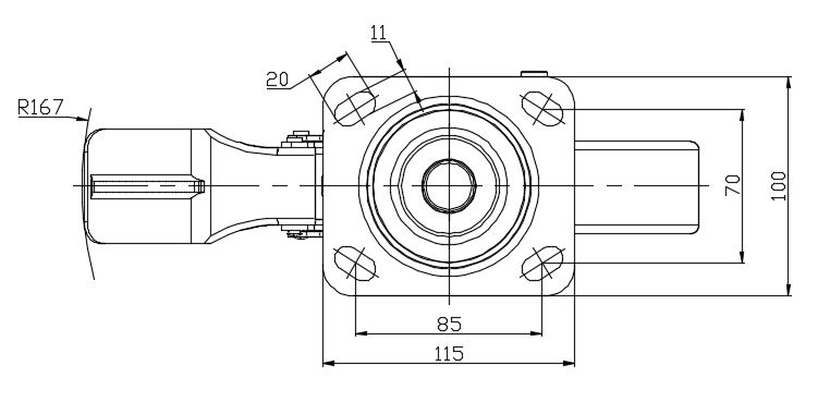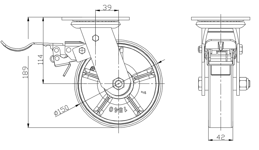 | 配有中煞式、锁定系统的脚轮。底板铆合冲压脚架—D型孔