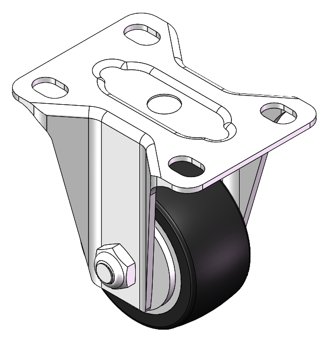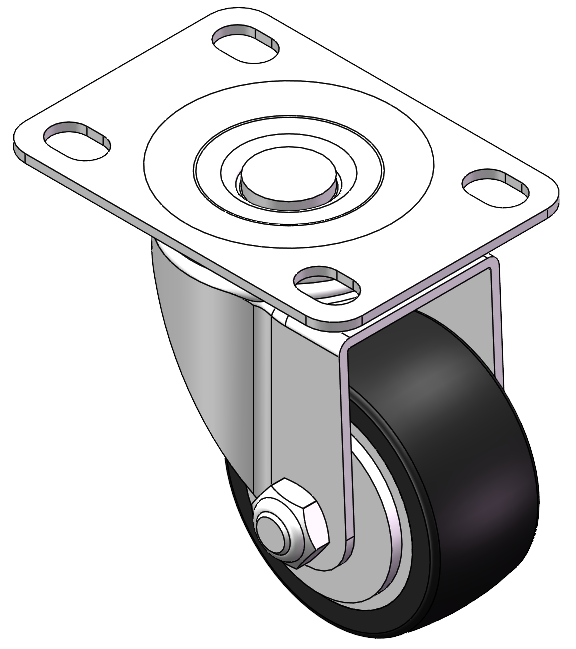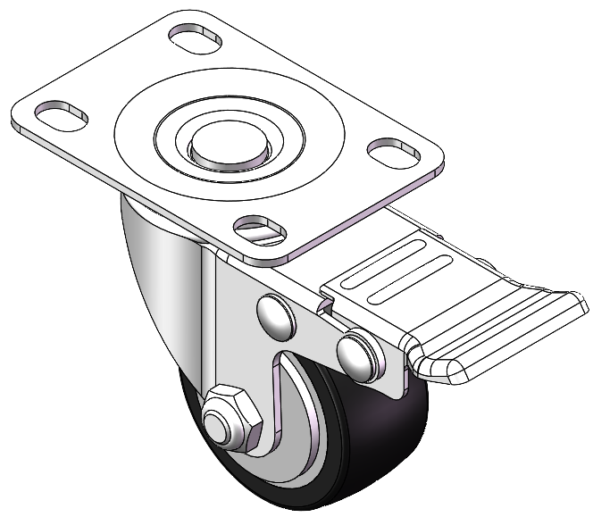 | Casters with Total Brakes and a Locking system. Top Plate with Riveted, Stamping Fork and 75 x 45 mm (3" x 1-3/4") Bolt Hole Spacing. Zine-Plated, Mounting Type - Top Plate. Polypropylene Wheel Center and tread. White and black. Bearing with Ball Bearing. |