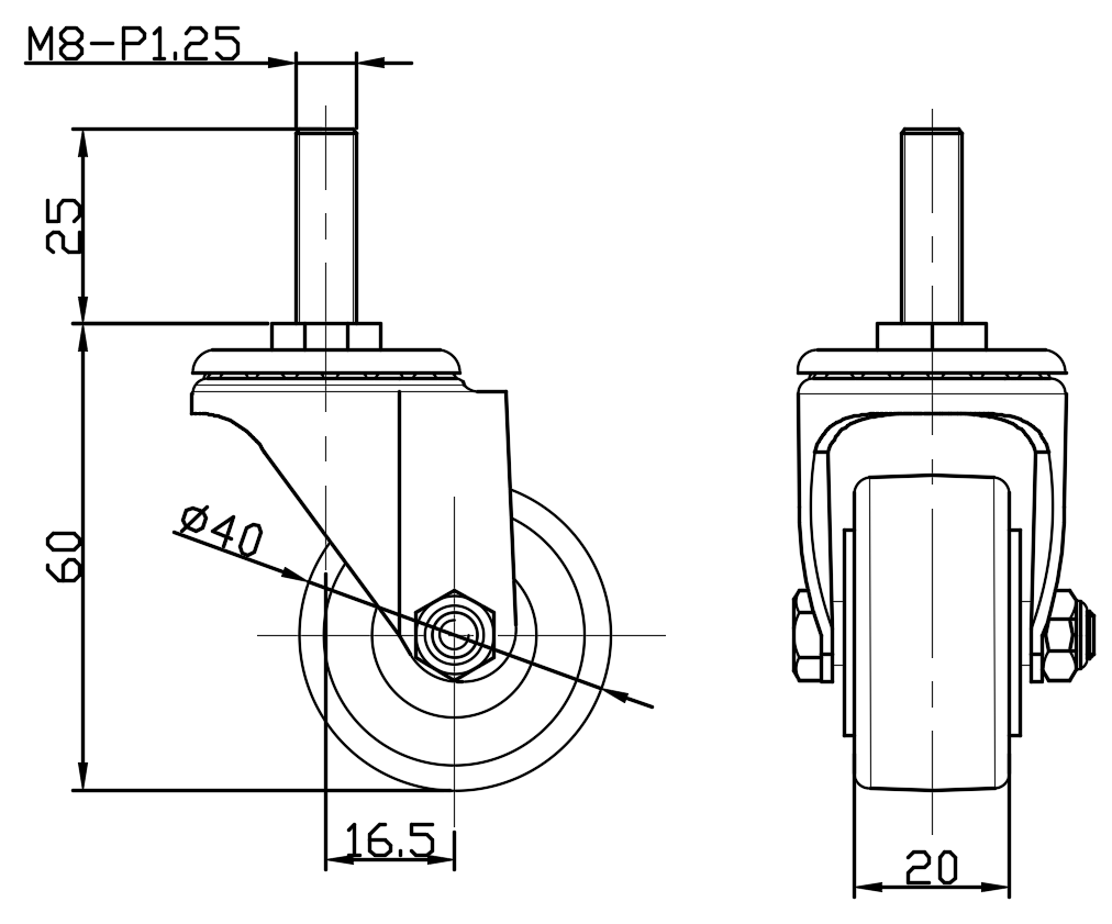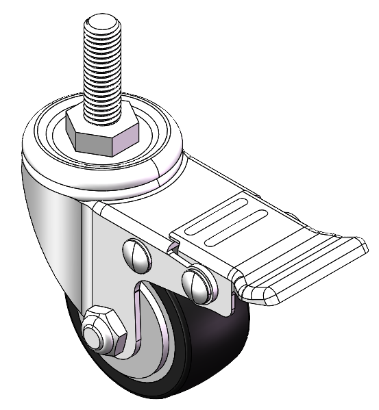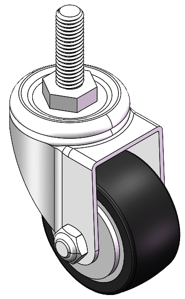 | Swivel Caster, thread-Riveted Stamping Fork—M8-P1.25 Zine-Plated, Mounting Type - Threaded Stem Polypropylene Wheel Center and tread White and black, Bearing—Ball Bearing. |